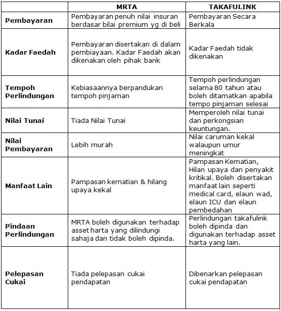 Dibawah merupakan berbezaan antara MRTA dan Takafulink: